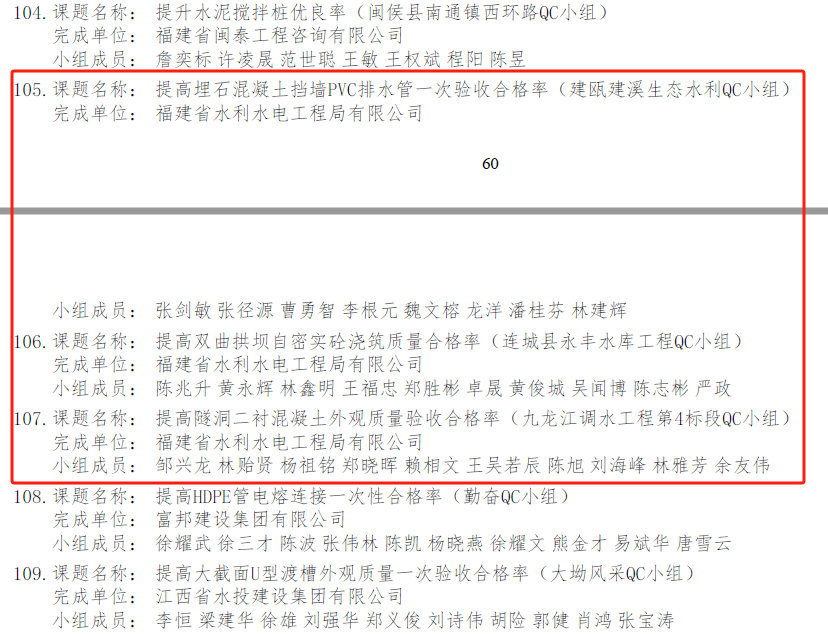 日前,工程局公司選送的8項QC小組成果全部通過中國水利工程協會評審,獲評2024年度水利工程優秀質量管理小組成果。其中,《提高土料碾壓筑堤一次驗收合格率》獲得Ⅰ類成果,《降低自來水廠混凝土池壁滲漏率》《提高高大模板安裝支撐體系一次合格率》《提高雙曲拱壩壩面測量精度》《提高隧洞光面爆破效果》獲得Ⅱ類成果,《提高埋石混凝土擋墻PVC排水管一次驗收合格率》《提高雙曲拱壩自密實砼澆筑質量合格率》《提高隧洞二襯混凝土外觀質量驗收合格率》獲得Ⅲ類成果,集中展示了工程局公司在建工程質量改進與創新發展水平。