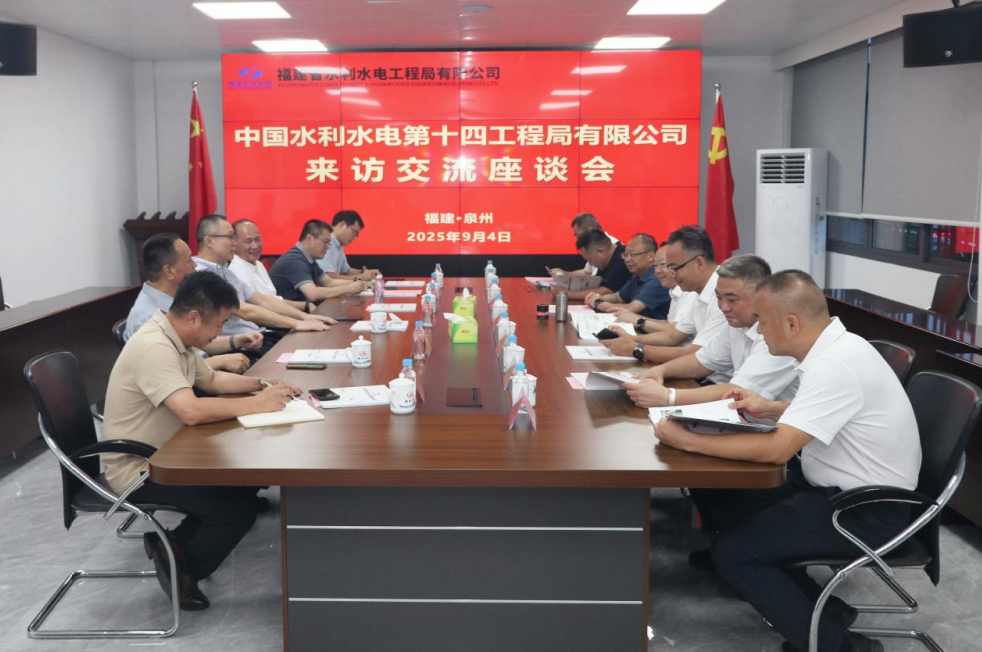 9月4日,中國水利水電第十四工程局有限公司黨委書記、董事長王曙平率隊到集團公司權屬工程局公司座談交流。集團公司黨委書記、董事長梅長河,黨委委員、副總經理葉輝,工程局公司黨委書記、董事長、總經理潘木枝等領導參加交流活動。