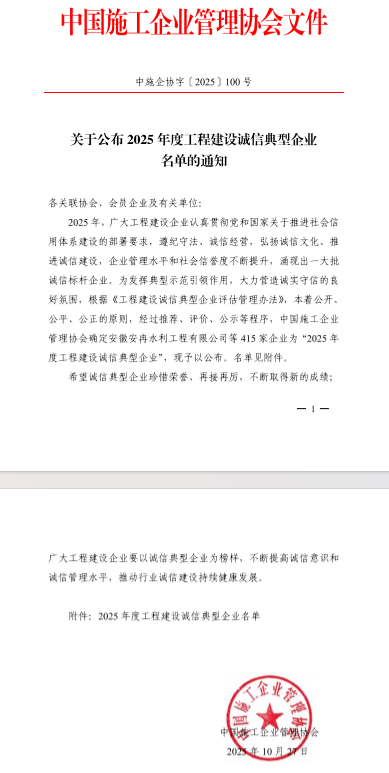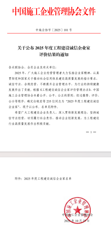 工程建設誠信典型企業評價工作是由中國施工企業管理協會組織開展,旨在增強工程建設行業自律意識,提高合規管理水平,推動行業信用建設高質量發展。本次獲評,充分彰顯了業界對公司長期以來堅持誠信經營、推動行業高質量發展的高度認可。