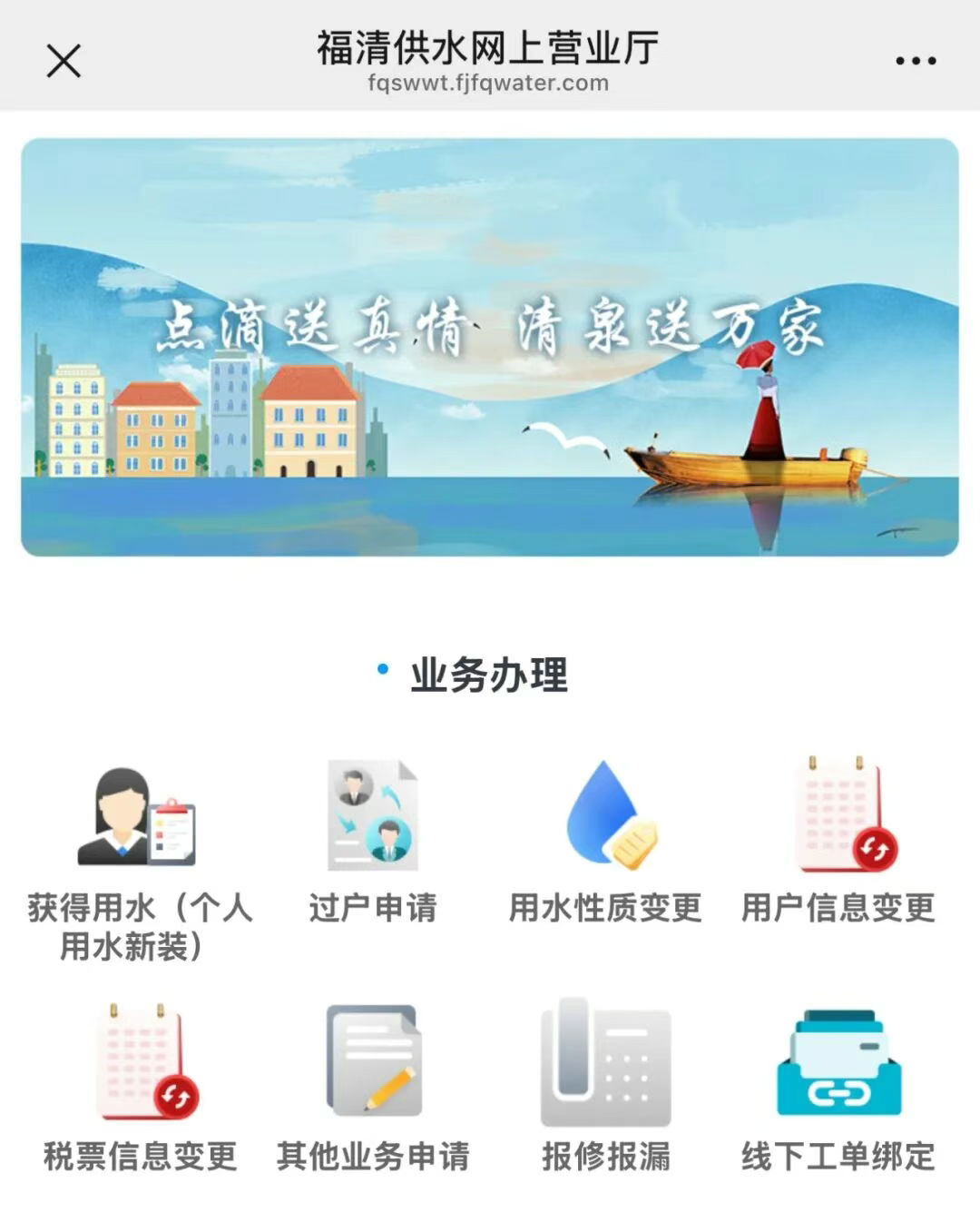 為進一步暢通線上線下訴求渠道,福建水投集團繼啟用統一供水服務熱線“96396”后,進一步整合旗下35家供水企業線上服務資源,依托微信服務號,打造統一供水服務平臺“福水e辦”,為全省近276萬用戶提供“一個入口、全線貫通”“掌上秒辦、全程零跑”的用水體驗