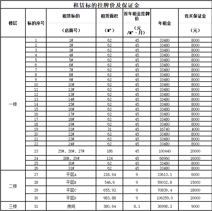 1、租賃標的掛牌價及保證金: