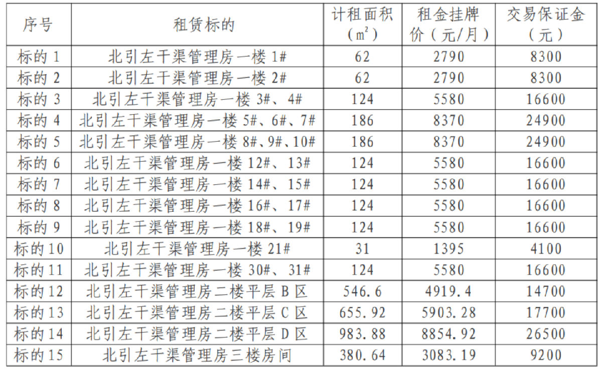 注:以上租賃標的分別招租。同一競租人在符合競租條件的前提下可報名競租單個標的或多個標的,報名競租多個標的的,需針對每一個標的交納足額交易保證金。